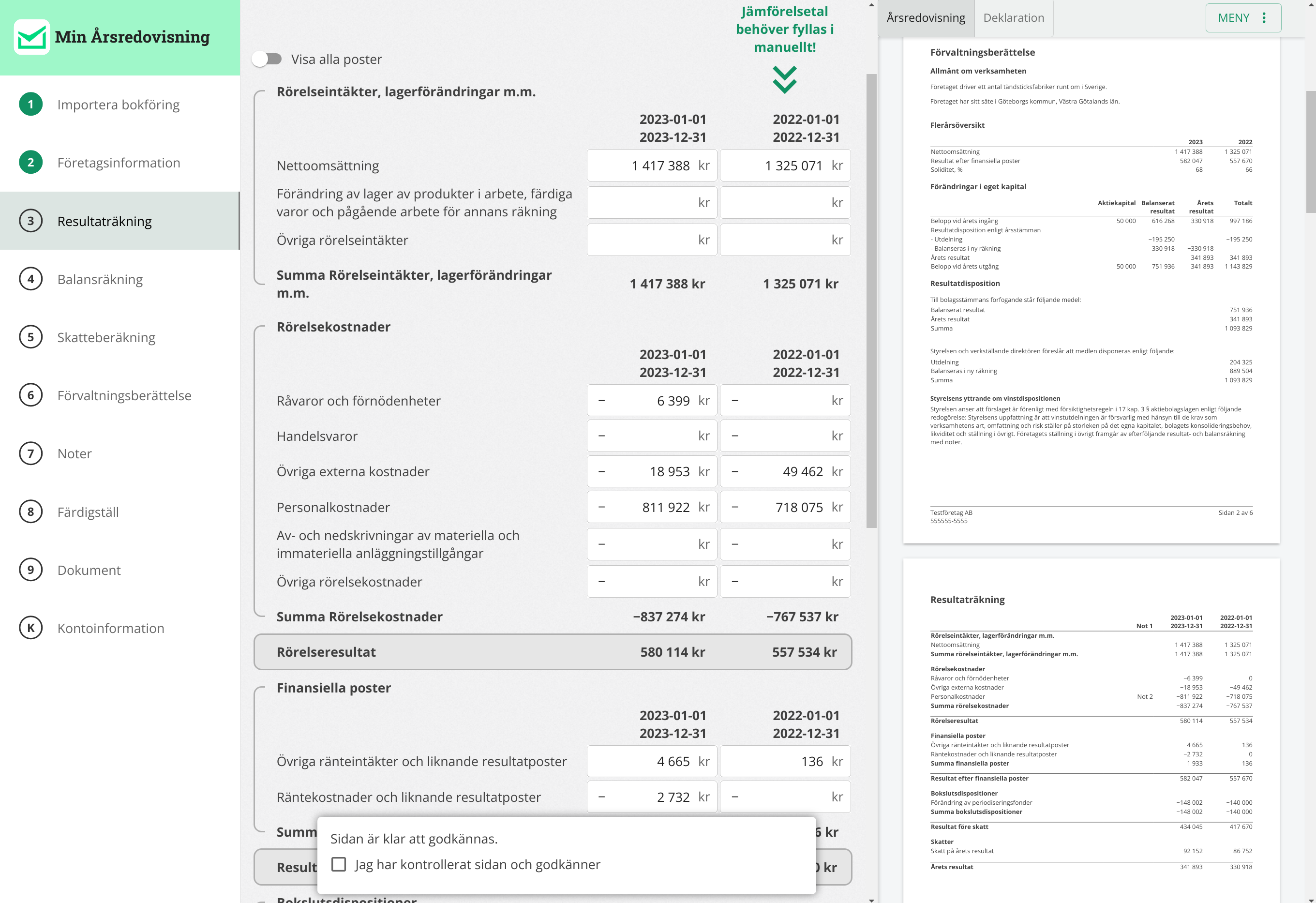 Om det inte är företagets första räkenskapsår så behöver resultaträkningen också jämförelsetal från räkenskapsåret innan. Jämförelsetalen behöver i dagsläget fyllas i manuellt (du hittar rätt siffror i årsredovisningen från förra året).